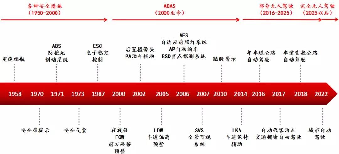 無(wú)人駕駛技術(shù)最初的發(fā)展從減少、防止機(jī)動(dòng)車事故開(kāi)始。從1950年至2000年,OEM車廠和Tier 1的零部件制造商對(duì)車輛發(fā)明、生產(chǎn)了許多結(jié)構(gòu)性的改進(jìn)。最核心的就是四大安全系統(tǒng):安全帶,防抱死制動(dòng)系統(tǒng)(ABS),安全氣囊和電子穩(wěn)定控制(ESC)。