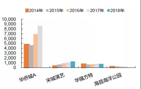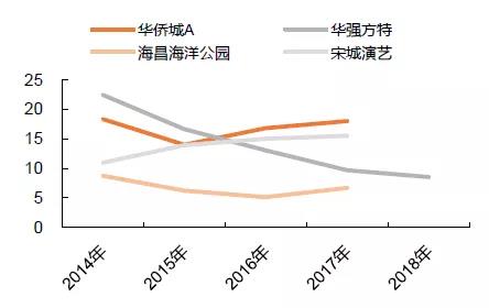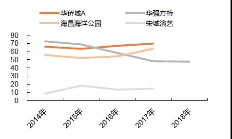 華僑城和海昌海洋公園均有地產(chǎn)開發(fā)業(yè)務(wù),其中華僑城以房地產(chǎn)收入為主,2018年上半年旅游業(yè)務(wù)收入占比32%;海昌海洋公園地產(chǎn)收入占比很低,且近年來聚焦主題公園業(yè)務(wù),地產(chǎn)收入占比明顯下降,從2010年的52%降低到2018年上半年的7%,主題公園營運收入占比達(dá)93%。