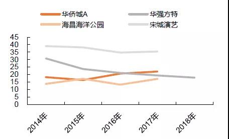 華強方特營業(yè)收入近年來穩(wěn)步提升,增速維持在10%以上,但新項目投產(chǎn)初期尚未實現(xiàn)盈利,歸母凈利潤在經(jīng)歷了2014、2015兩年的減少之后,又迎來5%左右的增速。華強方特毛利率高于其他公司,但由于不斷攀升的銷售費用,凈利率持續(xù)下降。公司走輕資產(chǎn)化方案,資產(chǎn)負(fù)債率逐年下降。由于華強方特業(yè)務(wù)擴張較快,新項目盈利能力不如人意,因此ROE持續(xù)下降。