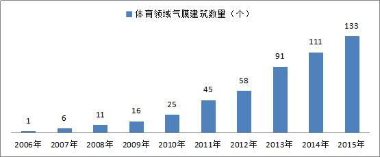 目前,世界上已經(jīng)建成有上萬個氣膜建筑了,2011年以后中國氣膜場地的數(shù)量迎來集中爆發(fā)期,全國每年新增項目數(shù)量基本穩(wěn)定在30個以上。截至2015年末,我國氣膜建筑總項目數(shù)達到215個,建筑面積達到88.76萬平方米;其中,現(xiàn)存的項目數(shù)量和建筑面積分別為197個和78.60萬平方米,現(xiàn)存率在90%左右。氣膜建筑可以應(yīng)用的范圍非常廣闊,但是我國目前還是作為運動場館的比較多,市場接受度也比較高。隨著社會對環(huán)保的關(guān)注,企業(yè)經(jīng)營過程中環(huán)保的成本要求越來越高,未來在工業(yè)領(lǐng)域,氣膜建筑還有更廣泛的應(yīng)用。