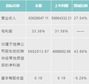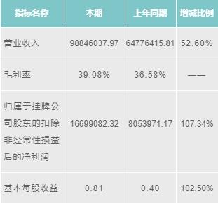 博德維2016年營業(yè)收入為98846037.97元,增長52.60%;毛利潤為39.08%;歸屬于掛牌公司股東的扣除非經(jīng)常性損益后的凈利潤為16699082.32元,增長107.34%;基本每股收益為0.81元/股,增長102.50%。